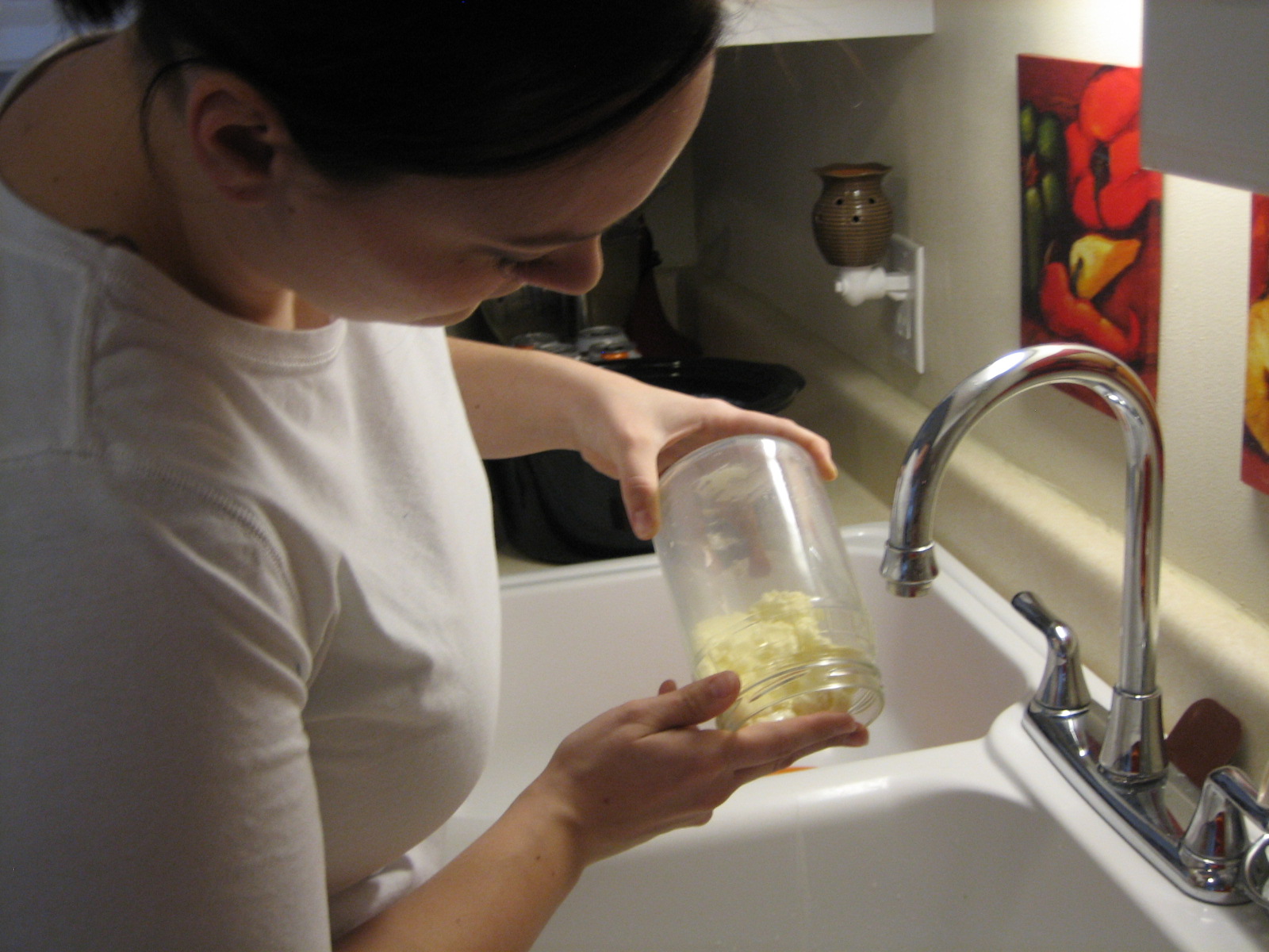 And, after a few days of trying to remind ourselves to set the cream out at a reasonable time so we would be able to work with it 12 hours later, we did it!! WE MADE BUTTER! I dunno why, but I just feel so good about myself knowing that I can do something like that. I love to create, and I strive to do things naturally when possible. Plus, it's just so simple. Simple enough that you can't really make any excuse about being lazy. We used an empty pickle jar. No - the butter did not taste or smell like pickles...but I'm surprised, to be honest, because the lid still had a faint pickle smell in the rim. =]